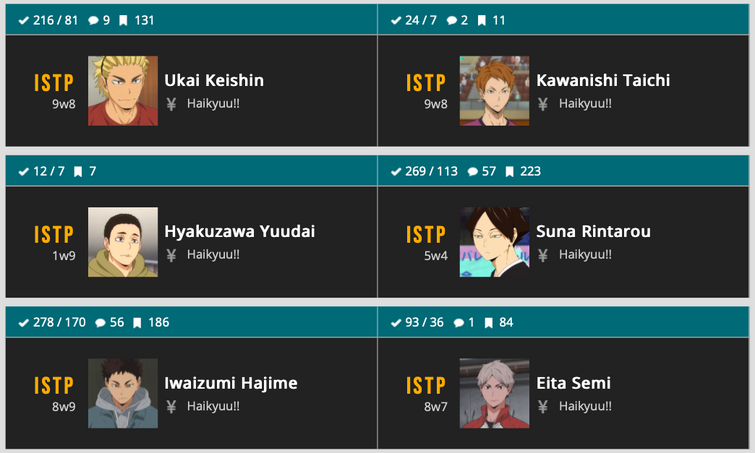 It is a mistake to think his instincts and willingness to depend entirely on his reflexes are intuition as jung meant it. All of the characters in haikyuu!! Rambling aside, i already knew a lot about the mbti types and looked to some of the more popular hq characters as reference. Tags anime guess the type haikyuu manga sports anime. This post is dedicated to all the characters who were featured in the anime from the karasuno boys' volleyball club.